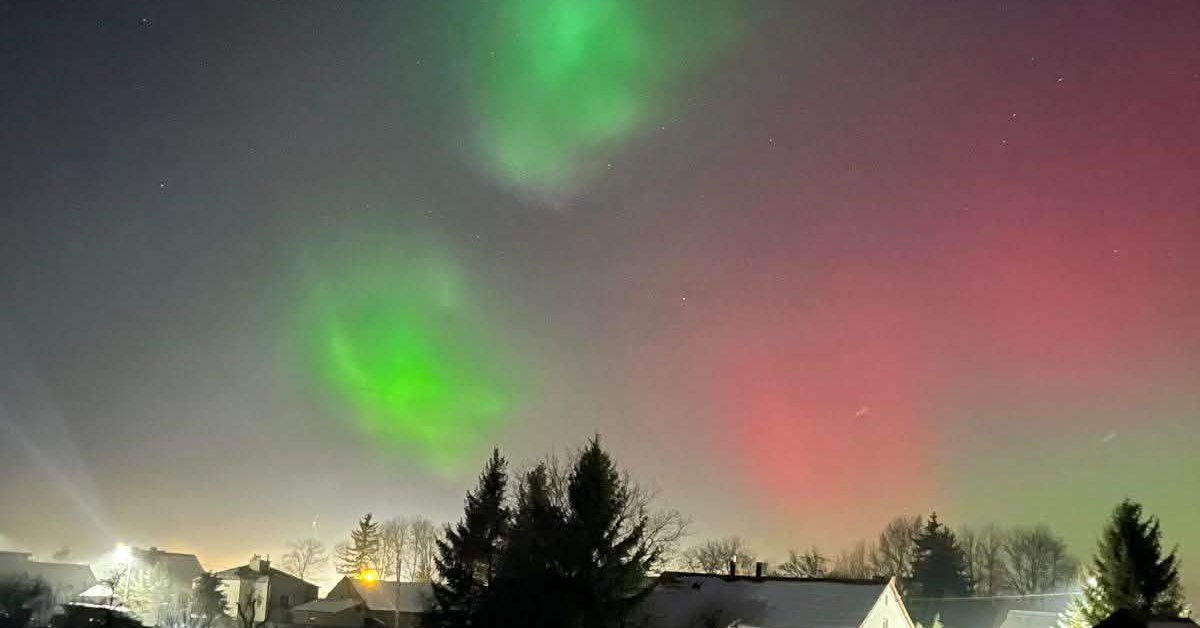 Zorza polarna nad Polską — nietypowe na naszych szerokościach geograficznych zjawisko można było obserwować minionej nocy niemal z każdego miejsca w kraju. Najintensywniejsza faza zjawiska przypadła na przedział między godziną 22 a 24 — podkreśla portal nocneniebo.pl.